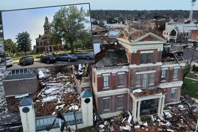 Prema Kurir-Journalu, zgrada suda i druge obližnje zgrade pretrpele su značajnu štetu tokom tornada u petak uveče, uključujući obližnju Prvu ujedinjenu metodističku crkvu, kojoj je tornado otkinuo krov i koja se delimično srušila, navodi se u izveštaju.