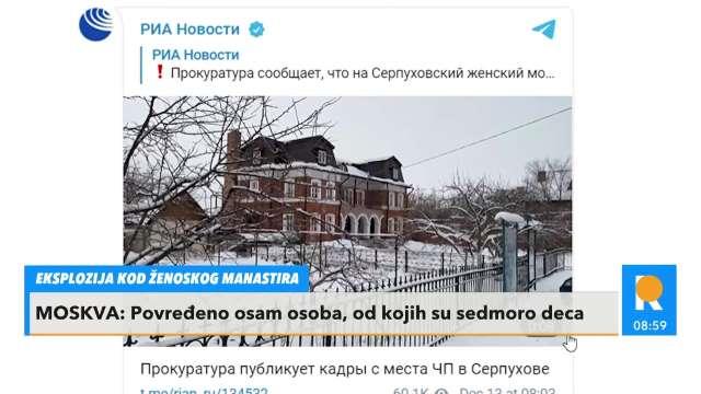 "Na teritoriji ženskog manastira u Serpuhovu nepoznata osoba aktivirala je eksplozivnu napravu. Na mesto događaja odmah su izašli istražitelji i kriminolozi glavne uprave Istražnog komiteta Rusije za Moskovsku oblast", saopštila je pomoćnica šefa tog komiteta Olga Vradij za Sputnjik.