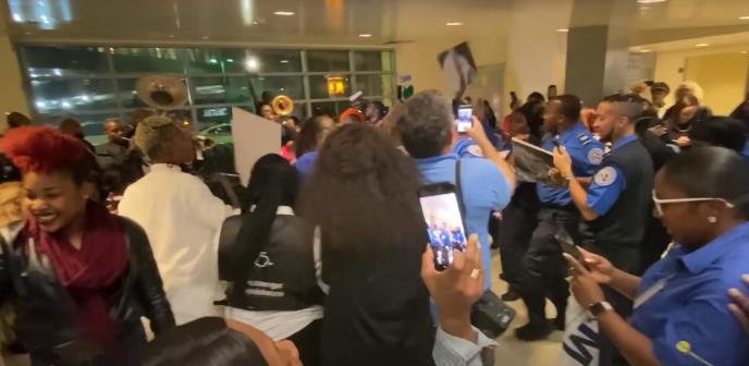 U slučaju terminala, ožalošćeni zapravo nisu tugovali, već su bili putnici koji su se pridružili improvizovanoj proslavi dok su drugi to gledali zbunjeno. Putnici koji su se ukrcavali na poslednji let za Tampu na Floridi, nešto posle 21:00, napravili su uzbudljivu verziju pesme "When The Saints Go Marching In“.