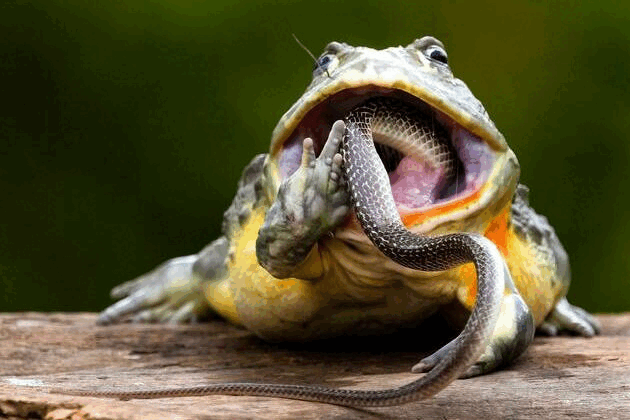 Žaba bik je smazala bez problema zmiju koja je bezuspešno pokušala da izbegne da joj bude lak obrok.