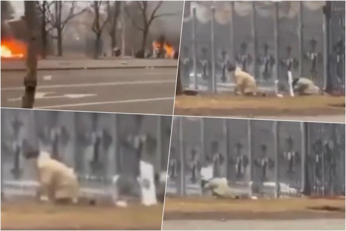 Na istom snimku se može videti kazahstanski pripadnik bezbednosnih službi koga je pogodio metak.