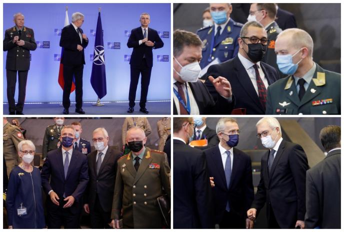 Generalni sekretar NATO-a Jens Stoltenberg, zamenik ruskog ministra spoljnih poslova Aleksandar Gruško i zamenik ministra odbrane Aleksandar Fomin odavali su, kako snimci pokazuju, utisak ozbiljnosti, dok su pozirali za medije u sedištu Alijanse, a nisu se rukovali.