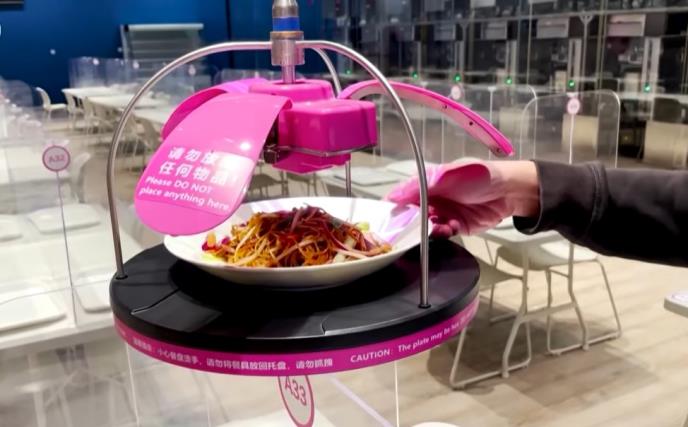 Kako se vidi na snimku, hrana vam stiže bukvalno sa plafona, a ceo proces od spremanja, pakovanja i isporuke je u potpunosti robotizovan kako bi se smanjili kontakti a time i mogućnost prenošenja zaraze.