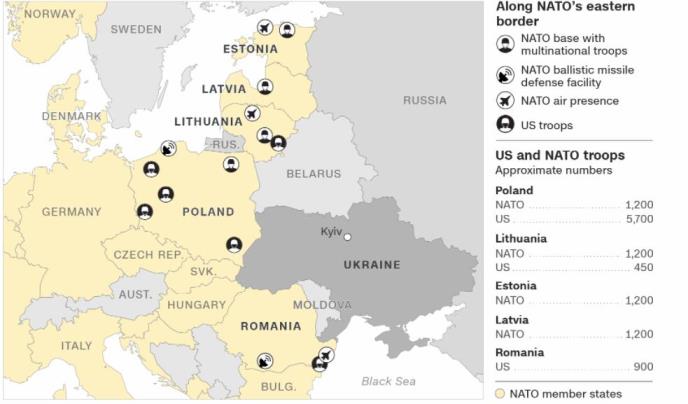 Oko 12.000 vojnika NATO i SAD čine prvu liniju odbrane u istočnoj Evorpi. NATO ima 22 bojna aviona u tom regionu i centar za balističke projektile u Rumuniji, dok se jedan gradi u Poljskoj.