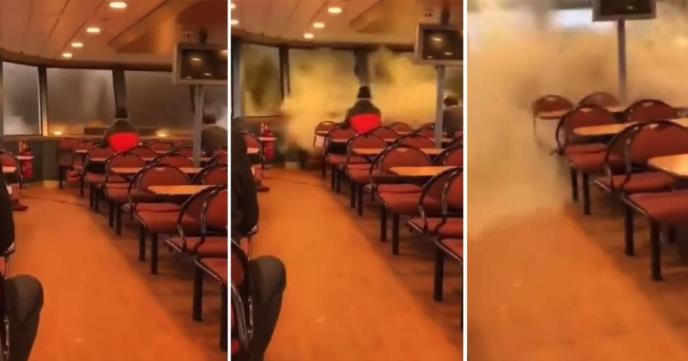 Na snimku se čuje vriska i vide se putnici kako u panici skupljaju svoje stvari i beže. Talas je bio toliko snažan da se na snimku može čudi kako se prozor lomi pod njegovom silinom.