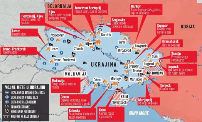 Prve mete bili su gradovi Odesa, u blizni koga je iskrcan i pomorski desant mornaričke pešadije, i luka Marijupolj na Azovskom moru. Sat vremena od početka invazije iz baze Engels u Stavropoljskoj oblasti poleteli su ruski strateški bombarderi „tu-95MS“ i „tu-160 M“, koji su na vojne ciljeve u Kijevu i Lavovu lansirali krstareće rakete „kh-31“, od kojih su neke pale i na kijevske ulice.