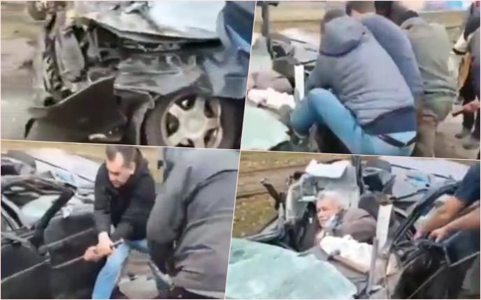 Na snimku, koji je objavljen na društvenim mrežama se može videti kako ljudi izvlače starijeg muškarca iz automobila kog je smrskao oklopno vozilo, a za koje su svetski mediji u prvi mah naveli da pripada Rusiji.