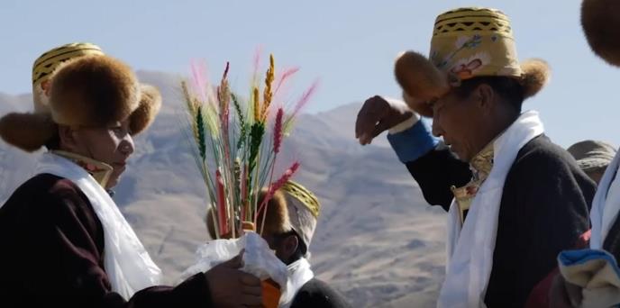 Stotine tibetanskih seljaka u svečanoj nošnji rade u polju, pevaju i plešu, prizivajući dobru žetvu ove godine.