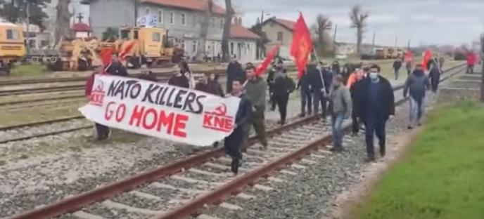 Aktivisti Komunističke omladine Grčke, koji su nosili transparent sa natpisom "NATO ubice, idite kući" i crvene zastave, u utorak su telima blokirali kompoziciju sa zapadnim borbenim vozilima.