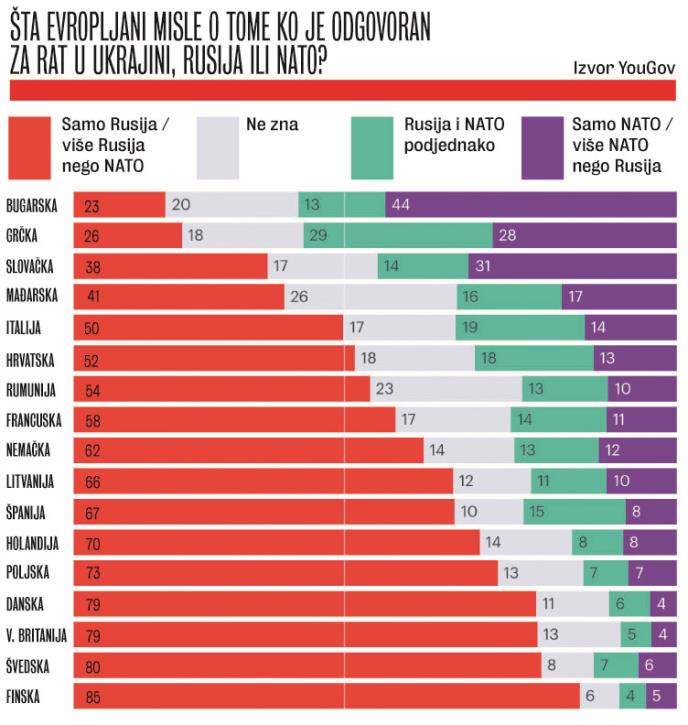 Čak 44 odsto Bugara i 31 odsto Slovaka smatra da je Alijansa izazvala rat, dok 85 odsto Finaca i 80 odsto Šveđana misli da je isključivo Rusija odgovorna