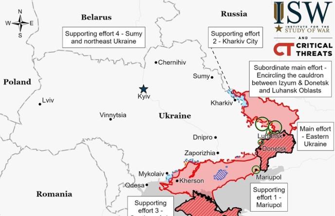 „Prema ukrajinskim zvaničnicima, ukrajinske snage će verovatno sprovoditi kontraofanzivne operacije kako bi isterale Ruse iz oblasti Izjuma. Ranije smo primetili da je veća verovatnoća da će ruska artiljerijska vatra usmerena zapadno od oblasti Izjuma poremetiti takvu kontraofanzivu.