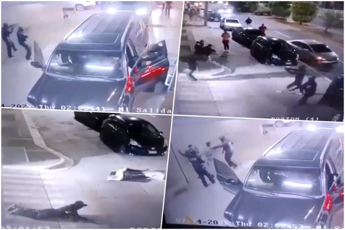 Snimci nadzorne kamere pokazuju da najmanje pet naoružanih muškaraca dolazi do prednjeg dela izlazne rampe na parkingu i trči u zgradu gde su naterali Saida Lobu Bonilu (23) i druge muškarce da izađu iz dva terenca.