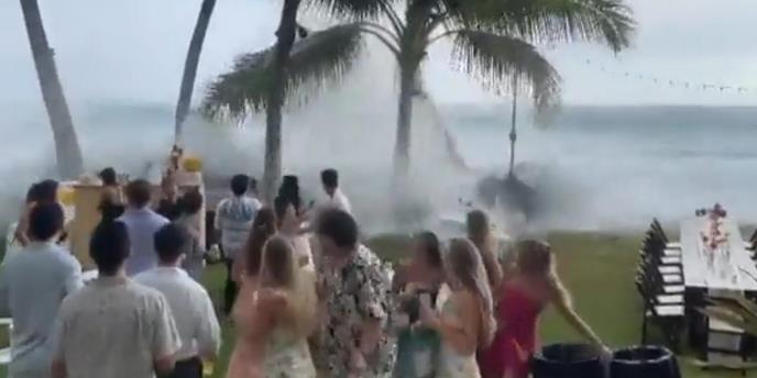 Po društvenim mrežama pojavio se snimak svadbene svečanosti u Kailua-Koni koju su prekinuli džinovski talasi, počistivši stolove i stolice po terasi.