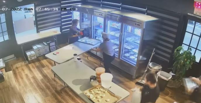 Na video snimku nadzora vidi se uobičajeno nedeljno veče pripremanja obroka i keteringa koje je postalo haotično za manje od 30 sekundi kada je čovek ušao u restoran i krenuo ka hrani u frižideru.