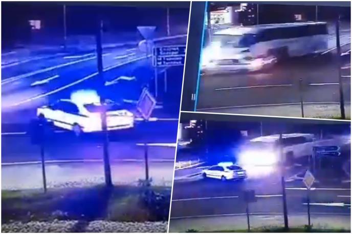 Naime na snimku se vidi policijski automobil, kako prilazi kružnom toku i zastaje, u trenutku kada je naišao autobus u punoj brzini, policajci su krenuli prema njemu u nameri da ga primoraju da stane ili skrene. Međutim, autobus je dodao gas i bukvalno odneo policijsko vozilo sa dva policajca koji su bili u njemu.