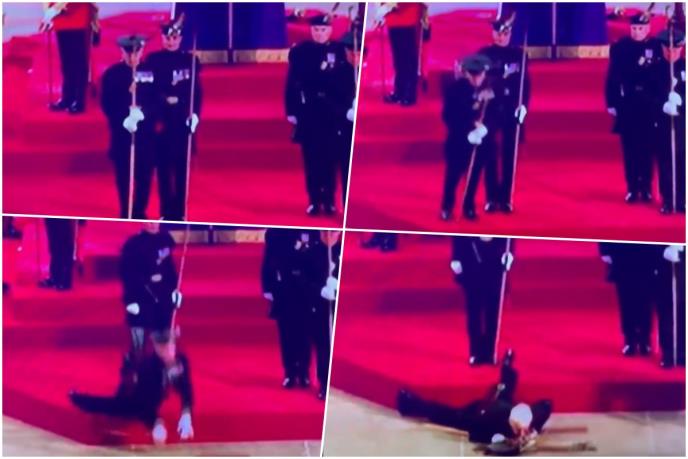 BBC-jev snimak podeljen na tviteru pokazuje kako stražar u uniformi odjednom pada i glavom udara o pod, dok stoji u blizini kovčega.