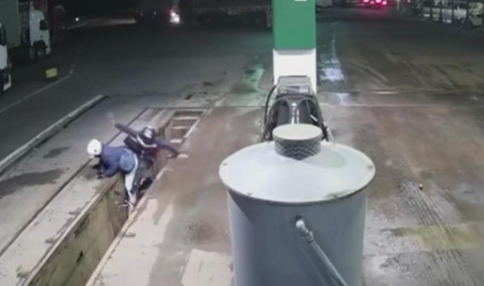 Kamera za nadzor na benzinskoj pumpi u jugoistočnoj brazilskoj državi Sao Paulo snimila je trenutak kada se par lopova zaleteo u mehaničarski kanal.