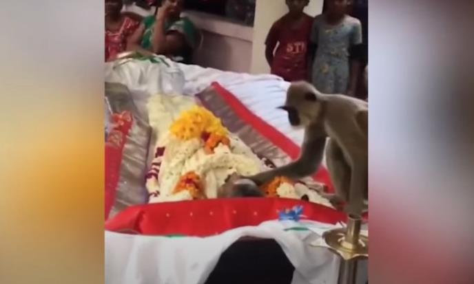Na snimku koji je osvanuo na društvenim mrežama vidi se majmun koji je došao na sahranu muškarca koji ga je redovno hranio kad god bi posetio njegov dom, prenose strani mediji.