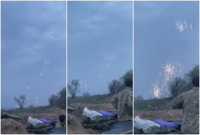Na Donjeckom ove rakete se često koriste, a sad sa linije fronta stiže jedan takav snimak, iz Bahmuta na kome se vide ukrajinski vojnici izlaze iz rovova, uzimaju telefone i snimaju delovanje termit minama po ruskim pozicijama.