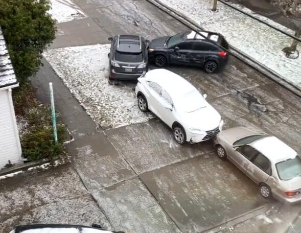 Na snimku koji je objavljen iz Sijetla vidi se automobil koji na sve načine pokušava da se kreće ulicom, ali proklizava i tada se sudara sa više automobila.