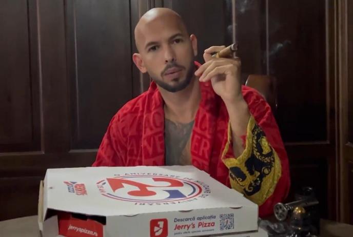 Na snimku vidi se Tejt, koji puši cigaru u ogrtaču, a osoba čiji se lik ne vidi na kameri dodala mu je gomilu kutija pica iz rumunskog lanca pica, Jerry's Pizza.