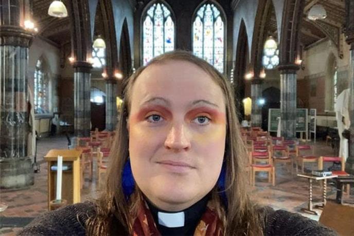 Ali sveštenik, koji radi u Liverpulu, sada se jasno izjašnjavaju o rodnim pitanjima i koriste društvene mreže da šire svoju poruku, uključujući objavljivanje selfija sa natpisima poput "Isus voli blještave senke za oči“.