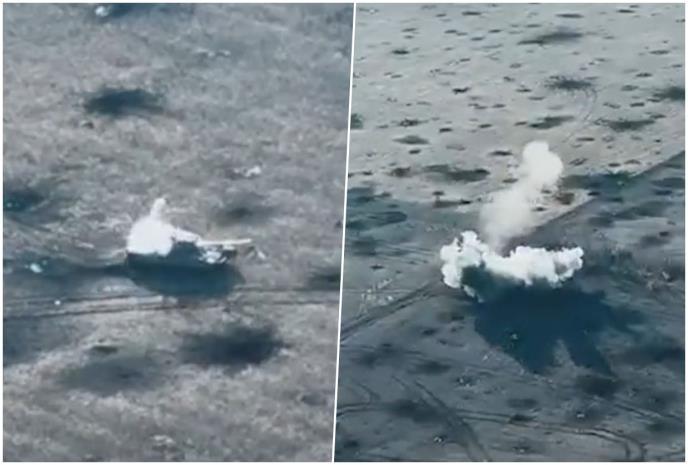 Na snimku, koji je zabeležen dronom, vidi se ruski tenk T-80 kako se kotrlja po minskom polju prekrivenom kraterima. Iznenada se na mestu gde je tenk bio nekoliko trenutaka ranije pojavljuje oblak dima, nakon što je prešao preko mine, prenosi Daily Mail.