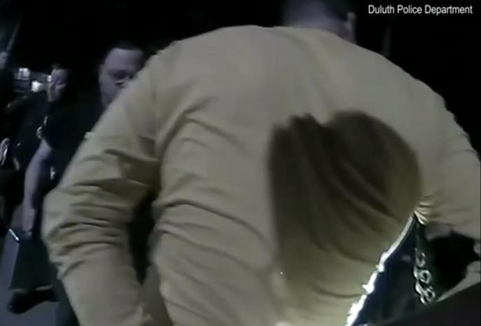 Na snimku, koji je objavila policijska uprava Duluta, može se videti više od deset policajaca, neki sa štitovima i šlemovima. Hasan je mirno sedeo na stepenicama do stana.