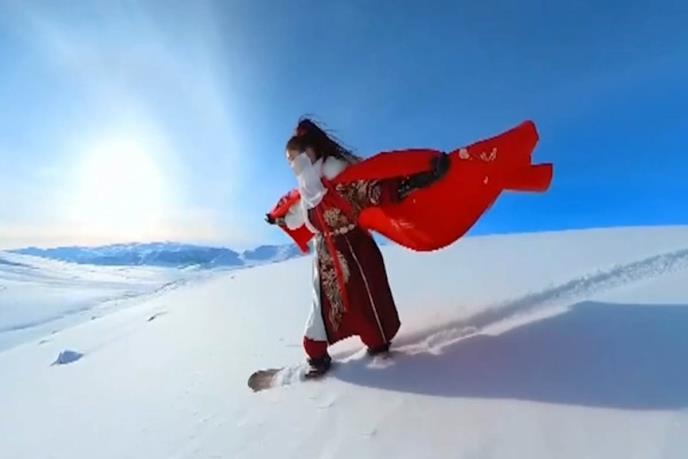 Devojka skija u tradicionalnoj kineskoj nošnji hanfu na skijalištu u Alteju u Sinđijang-ujgurskoj autonomnoj pokrajini.