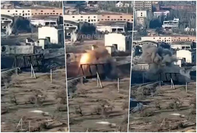 Na jednom od snimaka koji je objavljen na društvenim mrežama vidi se trenutak kada ukrajinski mineri dižu u vazduh metalni železnički most preko jednog od kanala sa nadom da će usporiti nastupanje.