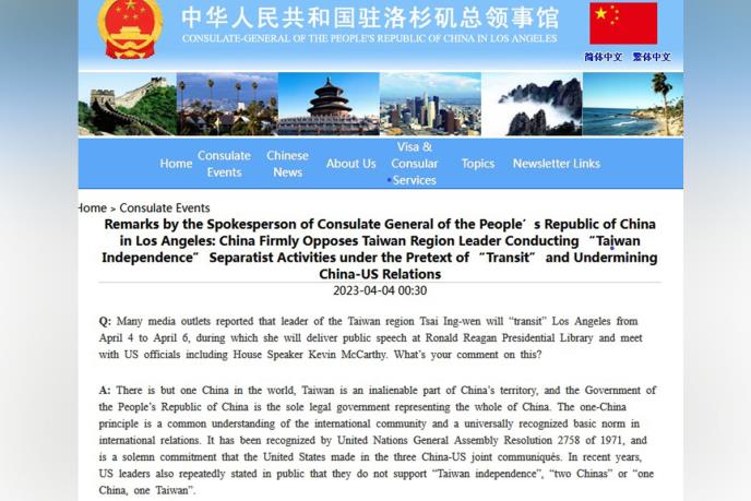 Generalni kineski konzulat u Los Anđelesu u ponedeljak je osudio takozvani tranzit liderke Tajvana Cai Ing-ven u SAD-u i upozorio američku stranu da prekine sve oblike zvanične interakcije sa kineskim tajvanskim regionom.