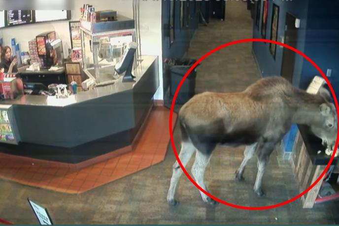 Snimak prikazuje ogromnu životinju kako ulazi u hol na veliki šok radnice za pultom. Mladi los zatim se poslužio kokicama pre nego što je napustio bioskop sa kutijom na nosu. Na snimku se vidi još jedan radnik bioskopa koji bojažljivo proviruje iz hodnika, alini ne pokušava da otera losa.