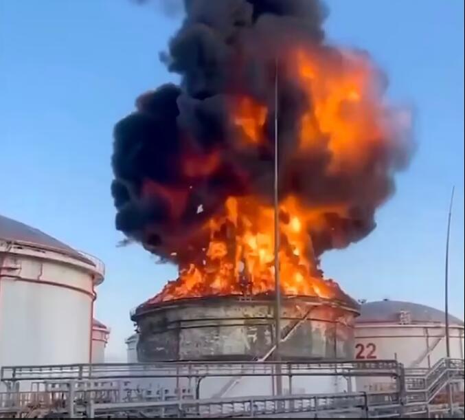 Ogroman plamen je izbio iz rezervoara nakon, najverovatnije, udara ukrajinske bespilotne letelice. U napadu niko nije povređen, a na snimku se vidi kako jedan rezervoar za gorivo izbacuje dim i plamen, piše Dejli mejl.
