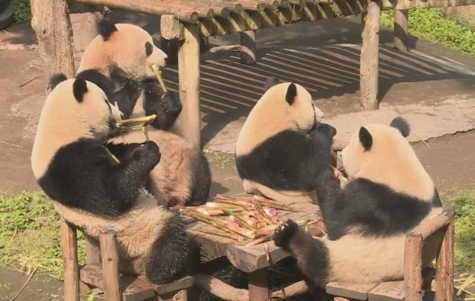 Četiri pande uživaju u svom obroku koji čine bambus, šargarepe i jabuke. Ove slatke pande privlače brojne posetioce i zbog toga je formirana tzv. „panda ekonomija”.