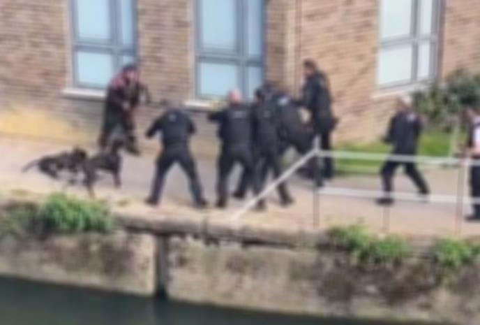 Video snimci koje su užasnuti svedoci objavili na društvenim mrežama prikazuju grupu policajaca koji prate čoveka sa dva psa, koji laju na kratkim povocima, duž kanala u Lajmhausu u istočnom Londonu .