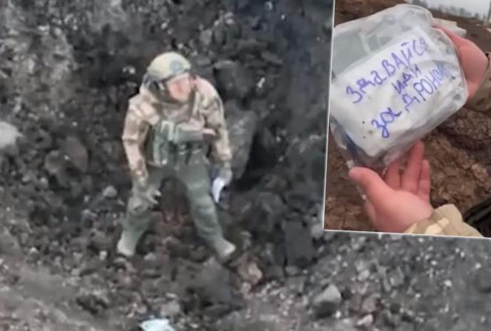 Ukrajinski Odred bespilotnih borbenih aviona otkrio je ruskog vojnika koji je tražio da ga ne bombarduju. Dao je znak za predaju i dobio poruku šta dalje da radi, ali nije sve krenulo dobro po njega.
