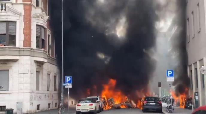 Kanal SkiTG24 je emitovao snimak iz milanskog kvarta Porta Romana, na kojem se vide visoki oblaci crnog dima koji se dižu između zgrada i vatrogasci na licu mesta.