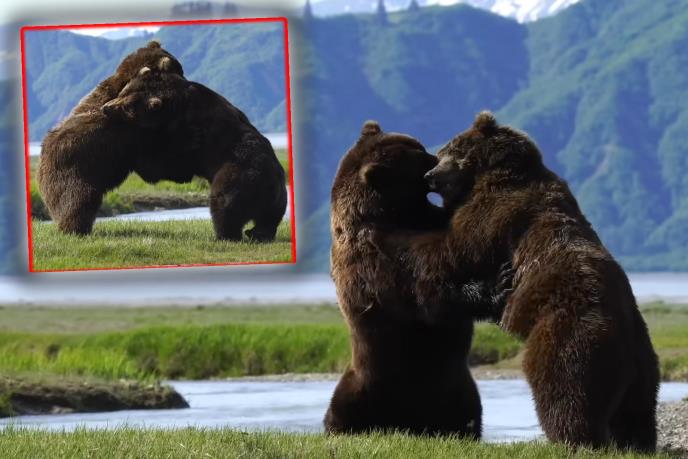 Snimak traje skoro devet minuta i počinje tako što se dva mužjaka usprave na zadnje noge i rvaju jedan protiv drugog. Na trenutak se vidi i kako hvataju dah pre nego što počne druga runda.