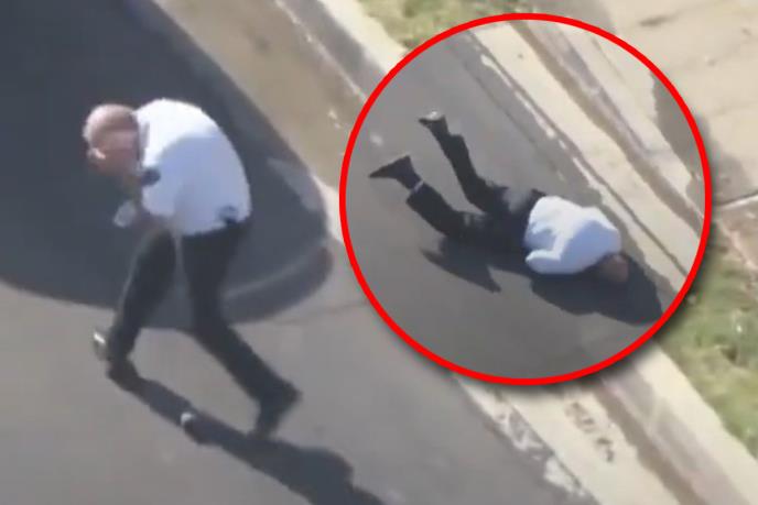 Kamera sa helikoptera medijske kuće Foks 11 uhvatila je šokantan trenutak kad jedan uniformisani pripadnik obezbeđenja tetura nakon napada od pčela, a zatim pada i udara glavom u asfalt.