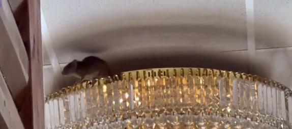 Na snimku, gledaoci mogu jasno da vide pacova kako stoji na vrhu jednog od staklenih lustera u restoranu, dok njegov dugačak rep visi kroz svetiljku.