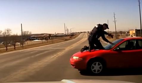 Snimak u kome se vidi kako je američki policajac uperio pištolj u osumnjičenog dok kleči na haubi automobila u pokretu - pre nego što se, kao u scenama iz akcionih filmova, uhvatio za krov vozila dok se vozač brzo udaljava - nedavno je objavljen.