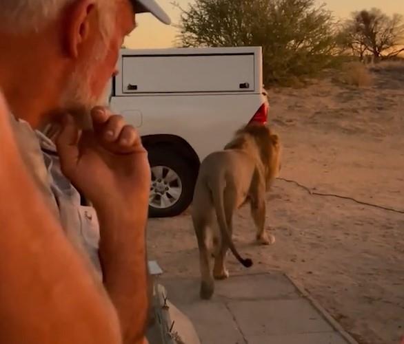 Safari kamperi u Bocvani imali su mnogo bliži susret sa divljim životinjama nego što je bilo planirano, pošto je veliki mužjak lava prošetao njiһovim kampom - bukvalno na metar od skamenjeniһ ljudi.