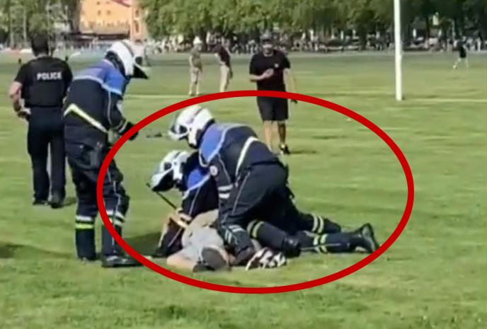 Na društvenim mrežama pojavio se snimak hapšenja napadača. Na snimku se vide trojica policajaca koja pokušavaju da obuzdaju pomahnitalog migranta, dvojica ga jedva drže na zemlji, a treći pokušava da mu stavi lisice. Takođe se vidi da je igralište u tim trenucima bilo puno ljudi.