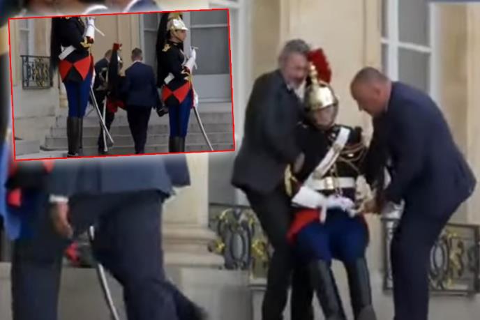 Emanuel Makron je prošle nedelje dočekao predsednika Madagaskara Andrija Radžoelina u Jelisejskoj palati, a jedan gardista koji je stajao iza njega iznenada je pao na zemlju i ostao bez svesti. Bolničari su brzo odneli stražara na nosilima.