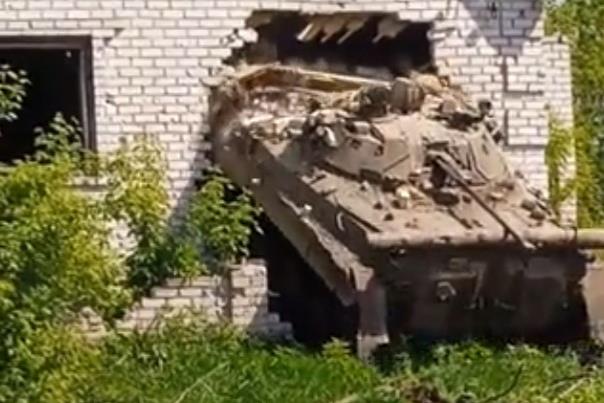 Na snimku se vidi kako oklopno vozilo iznenada probija zid i izlazi iz jedne napuštene seoske kuće?! Na vozilu nisu primetne oznake i nije moguće sa sigurnošću reći da li strai BMP-2 pripada Oružanim snagama Ukrajine ili ruskoj pešadiji.