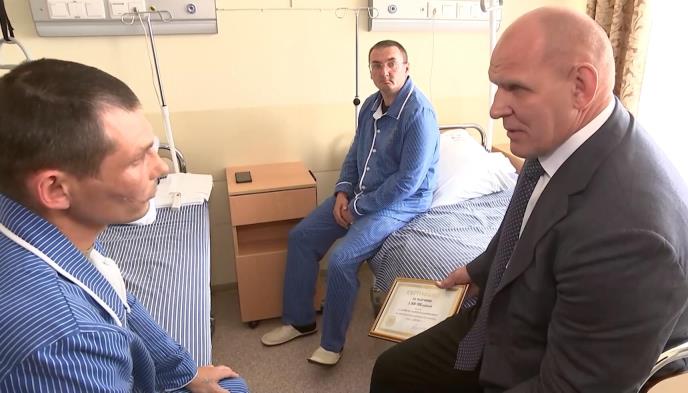 Na snimku koji je objavilo ministarstvo vidi se vojnik Andrej Kravcov kako sedi na bolničkom krevetu i prima nagradu od Aleksandra Karelina, trostrukog olimpijskog šampiona u rvanju grčko-rimskim stilom.