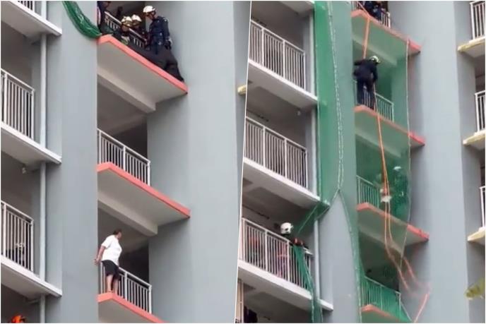 Jedan ju je zgrabio i naterao na ogradu, zadržavajući je zajedno sa drugom osobom koja je stajala sa druge strane ograde. Zajedno su oboje uspeli da je povuku dok su posmatrači odozdo aplaudirali. Događaj se odigrao u Singapuru, a spasioce slavi ceo svet.