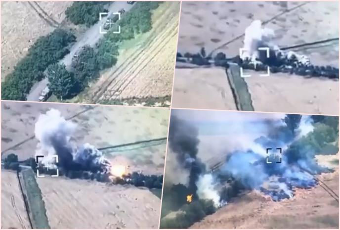 Ukrajinska vojska objavila je na društvenim mrežama snimak uništavanja kompletnog ruskog vojnog konvoja kod sela Očeretuvate u Zaporoškoj oblasti.