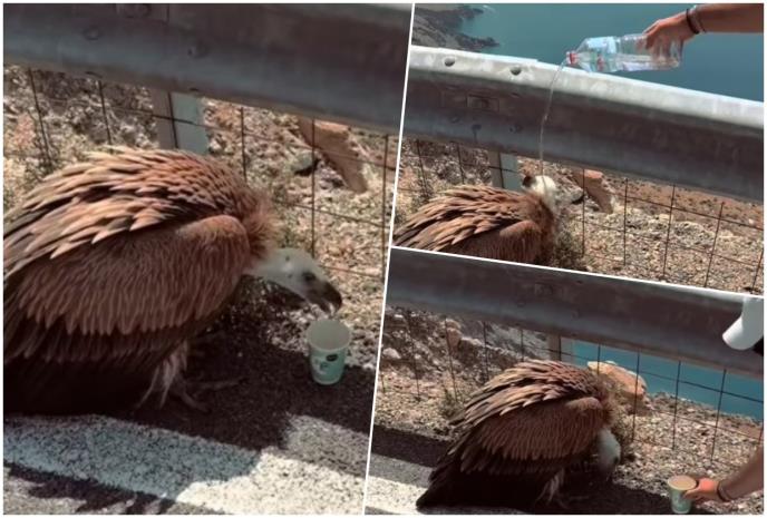 Na snimku, za koji se navodi da je načinjen u nedelju na Kritu, vidi se kako čovek prvo sipa vodu ogromnom lešinaru, a potom osvežava pticu prskajući ga vodom po glavi u perju.