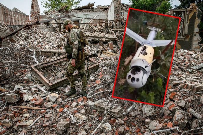 Na snimku koji je osvanuo na društvenim mrežama vidi se oštećeni dron kamikaza i vojnik koji ispituje oštećenu letelicu.